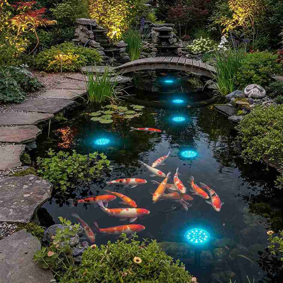 The blue lighting creates a mysterious, ethereal vibe that highlights the koi as they swim through the beams. The arch of the bridge provides a classic silhouette that adds height and architectural interest to the flat water surface.