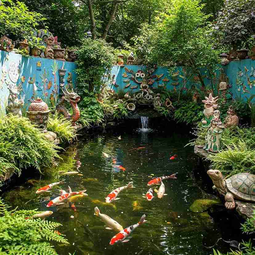 A bright turquoise blue wall serves as a backdrop for this unique pond, adorned with a massive collection of clay sculptures and mythical dragon figures. Ferns and ivy spill over the edges, surrounding a small central waterfall that trickles into a crowded, happy pond.