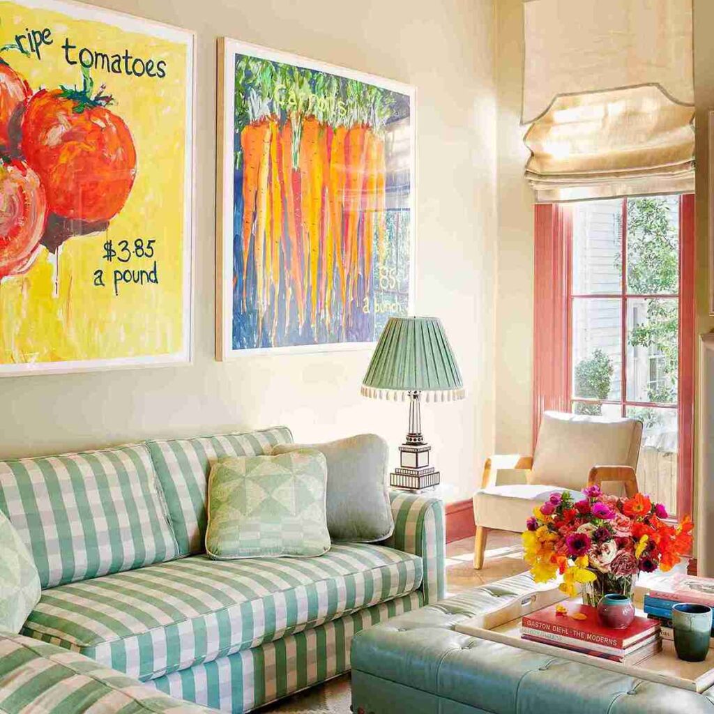 Artwork featuring coral tones and whimsical designs ties the room together, giving it a unique character. The overall look is both modern and welcoming, perfect for relaxing or entertaining.