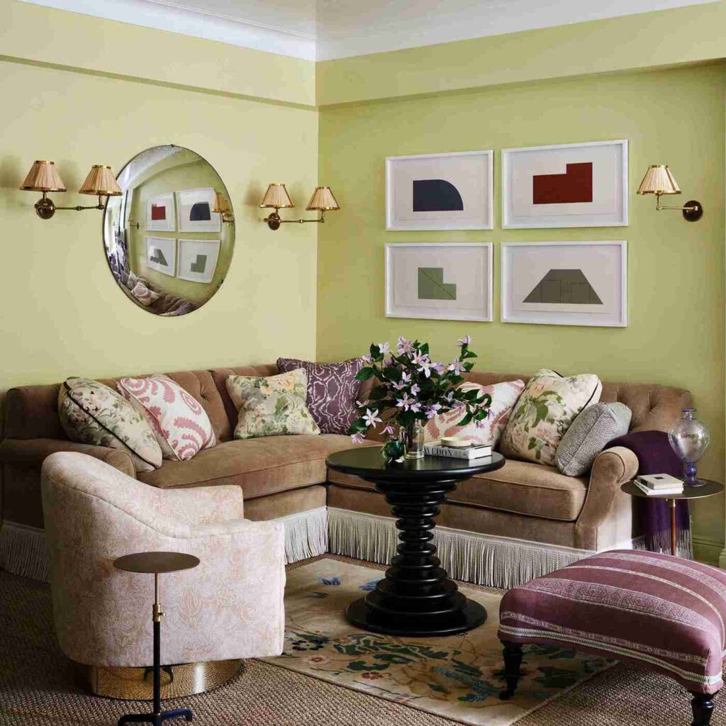 This living room showcases a beautiful blend of earthy greens and warm browns. The green walls create a calming backdrop, reminiscent of nature. It invites a sense of tranquility into the space.
