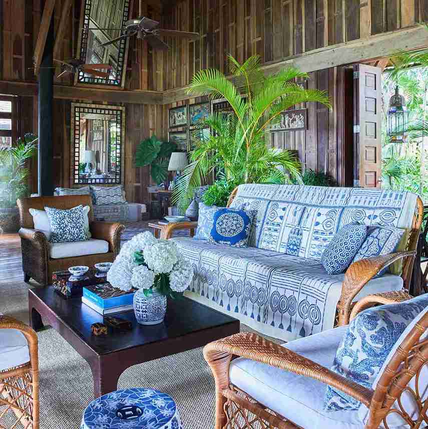 Plants and decorative elements add life to the space, balancing the coolness of blue with natural greenery. The overall design invites you to unwind and enjoy a peaceful moment at home.