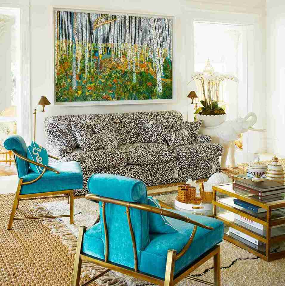 This living room showcases a lively teal color that instantly grabs attention. The walls are painted in a bold shade of teal, creating a fresh and inviting atmosphere.