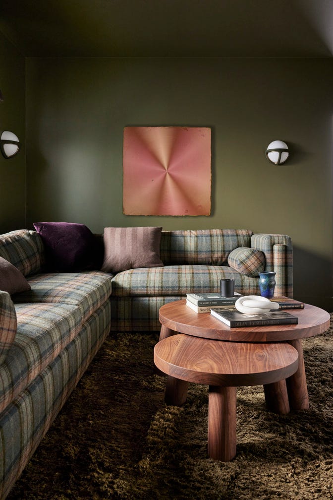 Olive is a fantastic “new neutral” because it has enough pigment to be interesting but is earthy enough to feel calm. It pairs perfectly with the warm wood tones of the furniture and the natural textures of the rug.