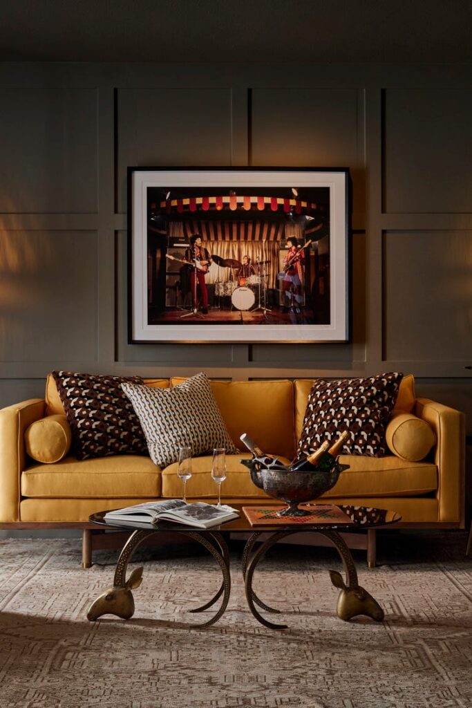 The design succeeds by embracing “duskier” tones to create a cozy, library-like atmosphere where the furniture seems to glow. The dark shelves allow colorful book spines and art pieces to pop with incredible vibrance.