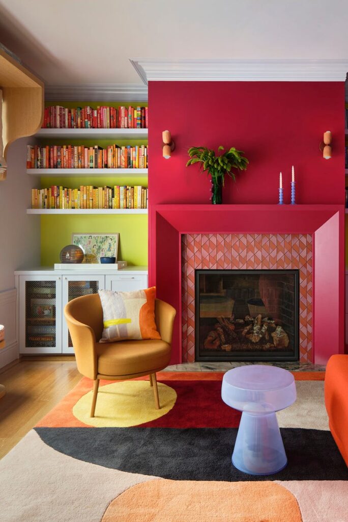 The choice of such a bright primary color works because it is balanced by the crisp white architectural details of the fireplace and crown molding. The contrast ensures the room feels intentional and curated rather than overwhelming.