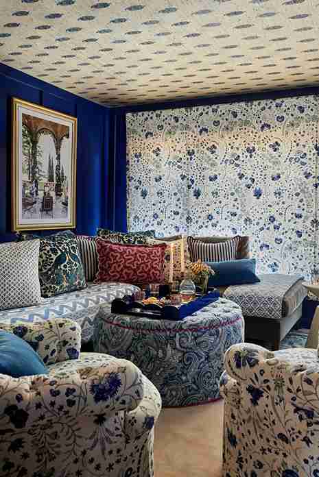 This room pulls no punches with a deep, electric royal blue on the walls and trim. The space is filled with blue and white patterned fabrics, from the sofa to the ottoman, and a patterned wallpaper on the ceiling.