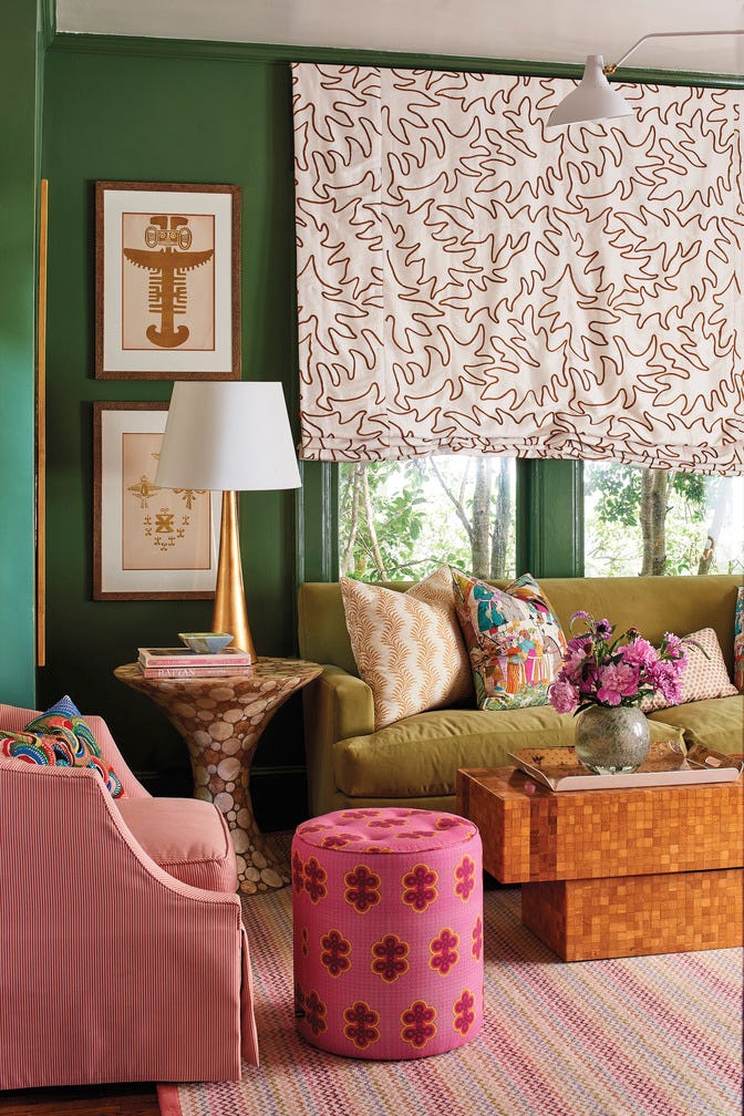 Rich forest green walls create a cozy, studious atmosphere in this living area. A tan sofa is paired with a pink armchair and a pink patterned ottoman, creating a sophisticated “pink and green” color story.
