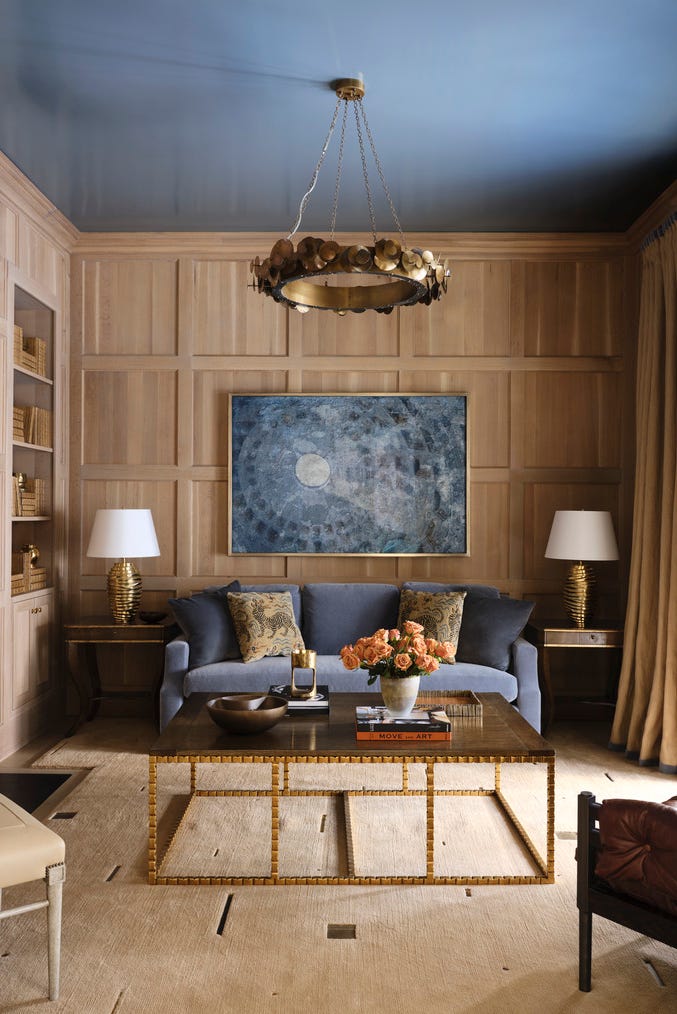In a stunning reversal, this room features warm, natural wood paneled walls and a striking celestial blue glossy ceiling. A blue velvet sofa sits in front of a large abstract painting that mimics the colors of the room.