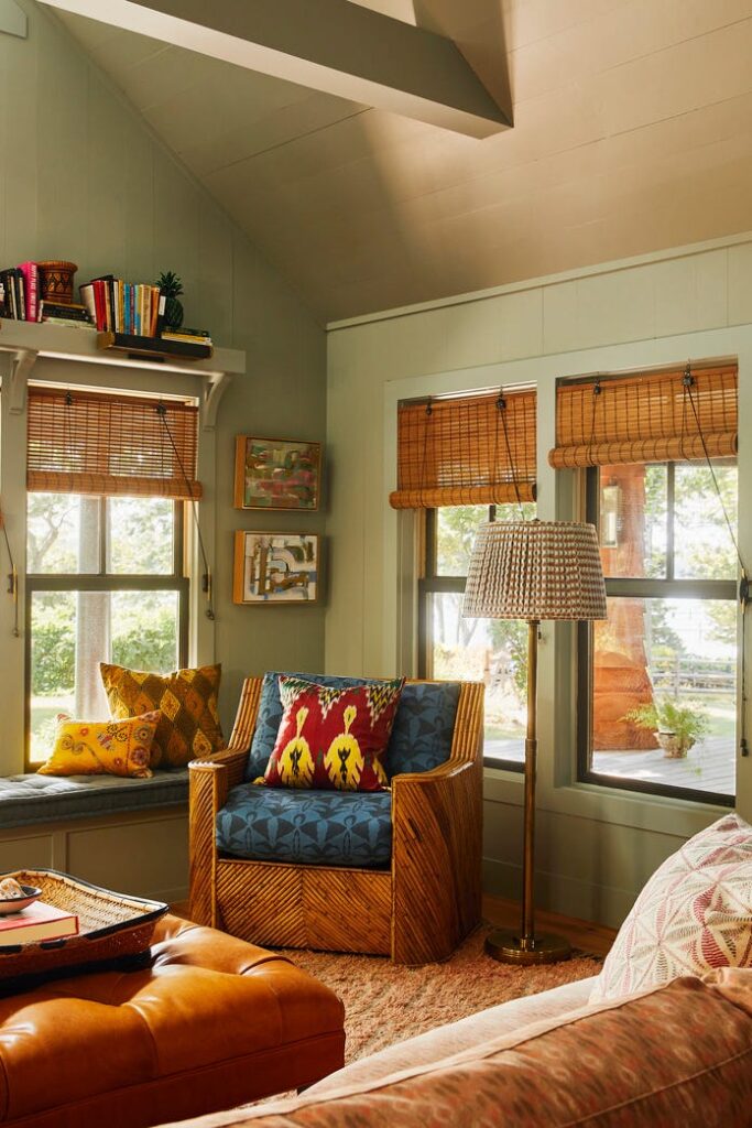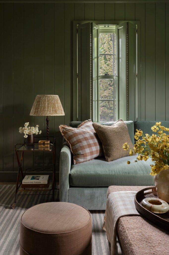 This cozy space features vertical wood-planked walls painted in a high-gloss olive green, including the shutters. A soft seafoam green sofa with gingham pillows adds a touch of “country-chic” charm.