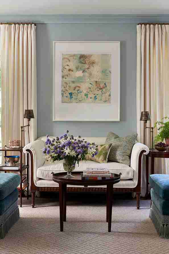 This traditional living room features walls in a light, smokey blue that feels incredibly timeless. A white sofa sits between two dark wood side tables, and cream-colored floor-to-ceiling drapes frame the space.