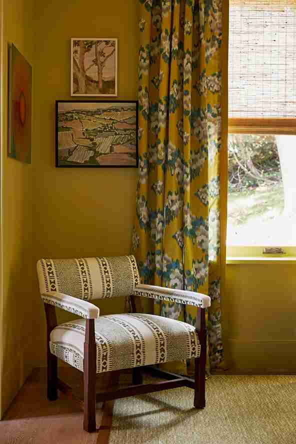 A small corner is transformed with a deep, golden ochre paint that feels rich and earthy. The color is complemented by mustard yellow patterned curtains and a neutral patterned armchair.