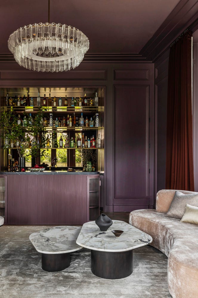 This ultra-glamorous room features deep eggplant or plum walls with matching molding and a built-in bar. A curved, champagne-colored velvet sofa and a marble coffee table add to the high-end feel.