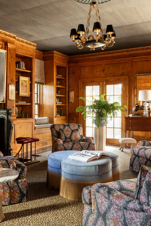 This traditional library-style room features warm, honey-toned wood paneling on all walls, contrasted with a dark slate-grey ceiling. A pale blue clover-shaped ottoman and leopard print carpet add unexpected patterns.