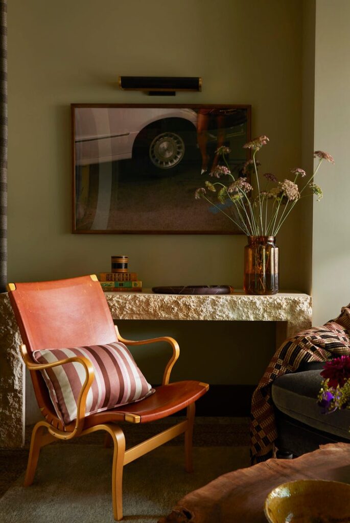 A beautiful, muted sage green covers the walls of this minimalist but warm living space. A cognac leather chair and a rough-hewn stone console table provide natural, organic textures.