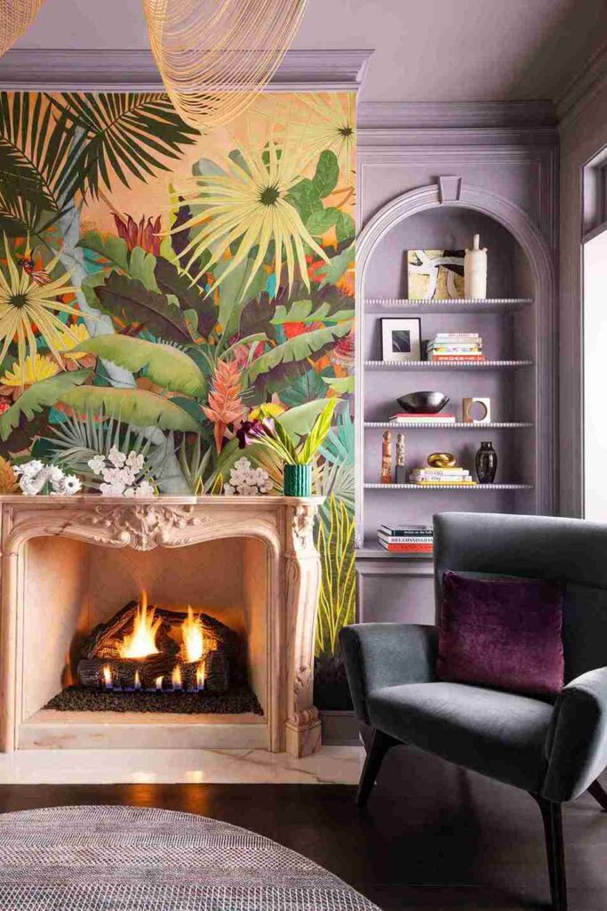 This imaginative room combines soft lavender walls with a large, vibrant tropical mural behind a classic stone fireplace. A deep charcoal velvet armchair with a purple pillow sits nearby, tying the color story together.
