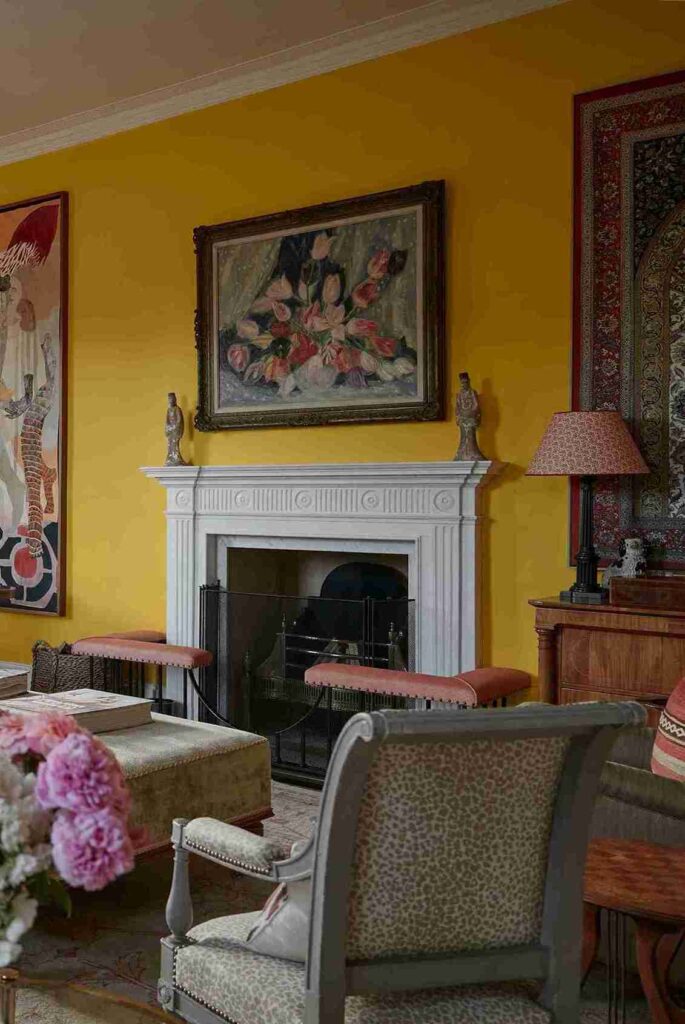 This vibrant space features a saturated, warm yellow wall that serves as a high-energy backdrop for a classic white fireplace. Above the mantel, a framed floral painting sits between two small sculptures, while a patterned red lampshade and leopard print chair add to the eclectic mix.