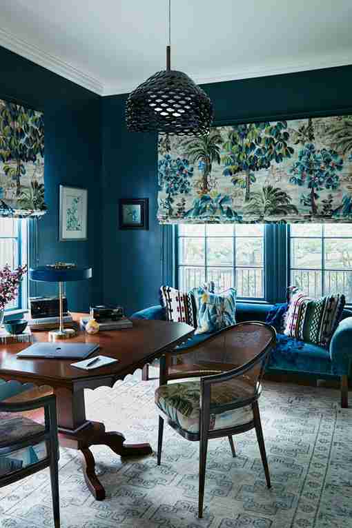 This room embraces the dark side with a stunning, deep teal paint that wraps around the walls and window frames. The space is styled as a moody home office or lounge, featuring tropical print Roman shades and a plush teal velvet sofa.