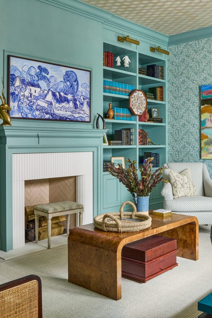 Mint green walls and matching built-in bookshelves create a refreshing, cohesive look in this bright living room. One wall is accented with a delicate leafy wallpaper, and a white fluted fireplace adds a touch of modern texture.
