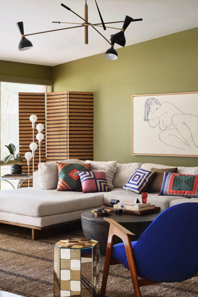 A muted olive green wall serves as the backdrop for this mid-century modern living room. A large, neutral sectional sofa is accented with geometric pillows, and a striking blue chair adds a bold pop of color.