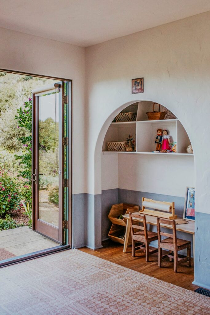 This charming, rustic space uses a two-tone paint effect with a creamy white on the top half and a soft, muted lavender-grey on the bottom. An arched built-in nook provides a sweet display area above a simple wooden child’s desk.