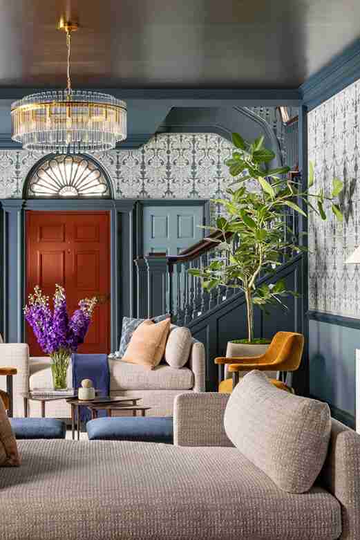 A large, open living space is defined by slate blue walls and matching trim, accented by a striking terra cotta orange door. The room features a dark, glossy ceiling that reflects a tiered crystal chandelier and a grand staircase with patterned wallpaper.