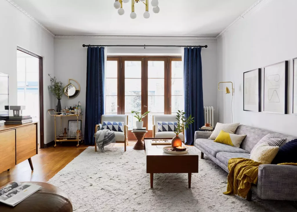 A grey tufted sofa is accented by a mustard yellow throw and deep navy curtains that frame a garden view. A gold sputnik-style chandelier hangs above a plush white shag rug and a wooden coffee table.