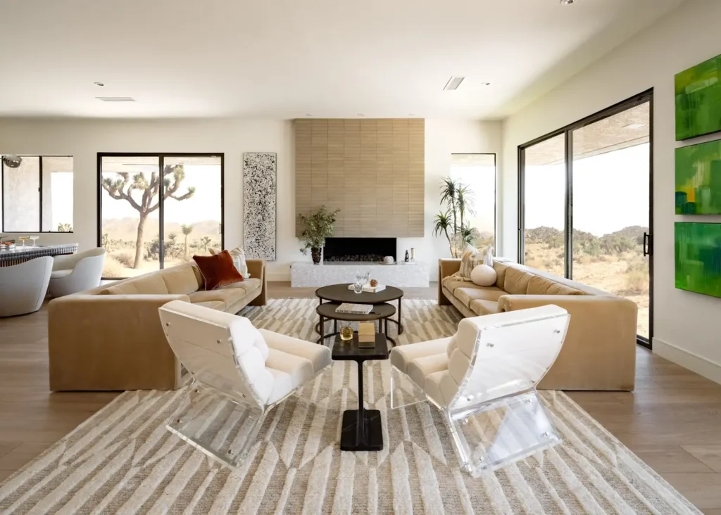 Two large tan sofas face each other over a striped rug, with clear acrylic chairs providing extra seating without adding visual weight. The room looks out through massive sliders onto a Joshua Tree desert landscape.
