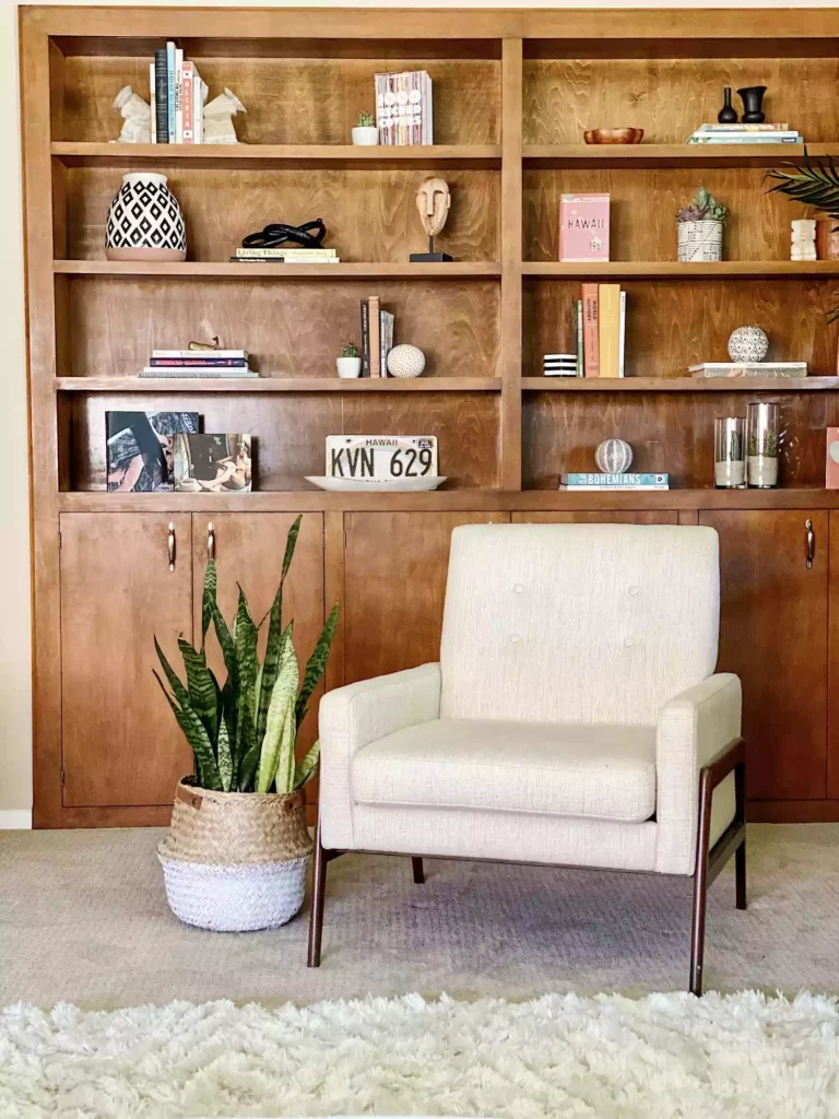 This cozy nook centers around a floor-to-ceiling built-in plywood bookcase and a simple cream-colored armchair. A large snake plant in a woven basket adds a refreshing organic element to the corner.