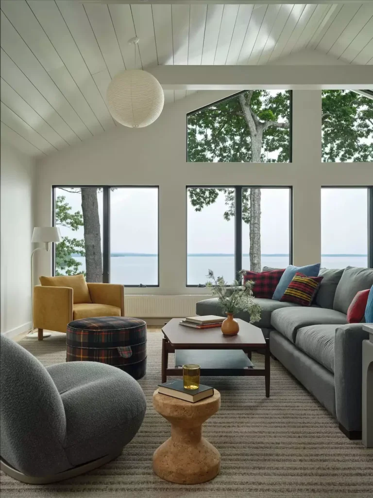 The design succeeds by using low-profile furniture that refuses to block the incredible view through the black-framed windows. Pops of yellow and plaid add a touch of personality to the otherwise muted color palette.
