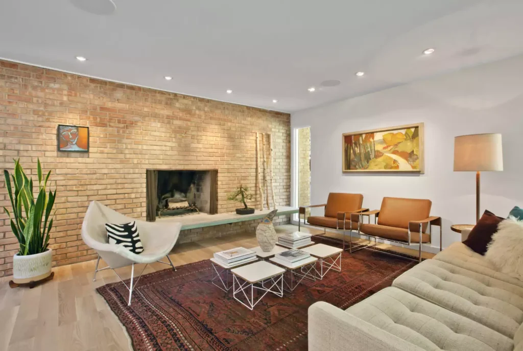 A long, low brick fireplace wall is the main feature of this room, which includes cognac leather chairs and a white butterfly chair. A large tribal rug adds a deep red base to the seating arrangement.