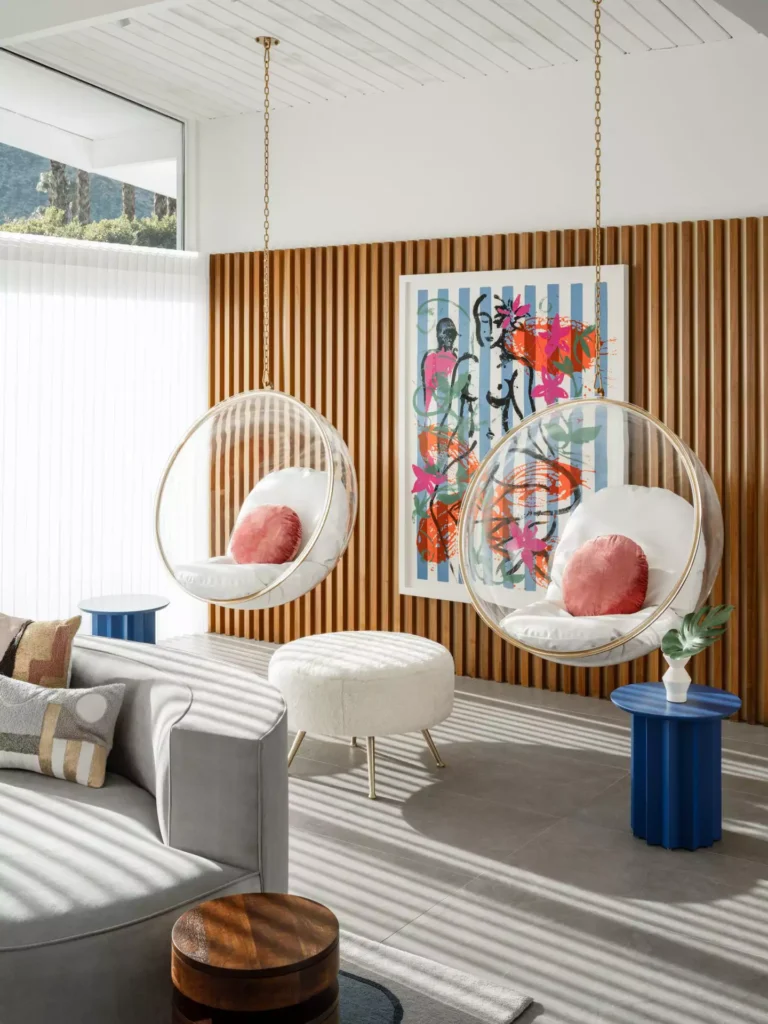 Two clear acrylic hanging bubble chairs with plush pink cushions steal the show against a beautiful slatted wood feature wall. A curved grey sofa sits nearby, illuminated by soft light filtering through vertical blinds.