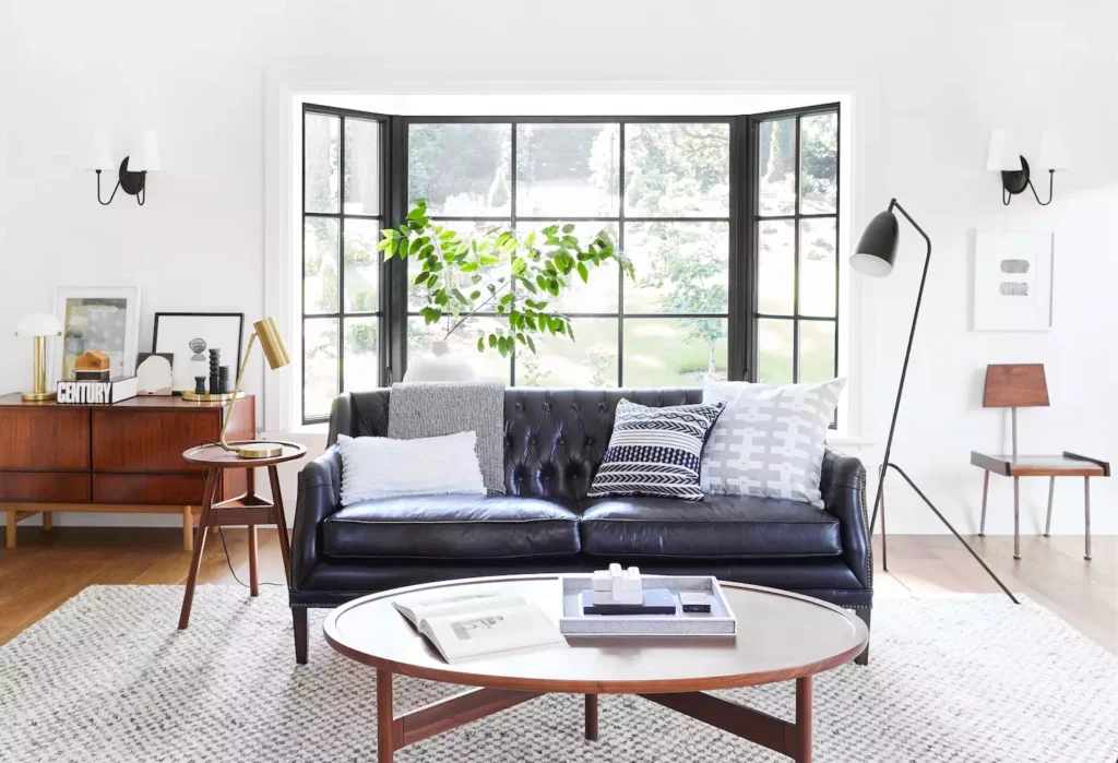 A black tufted leather sofa sits perfectly within the span of a large bay window, flanked by thin black floor lamps. A rich wood credenza to the left holds a curated selection of art and lighting.