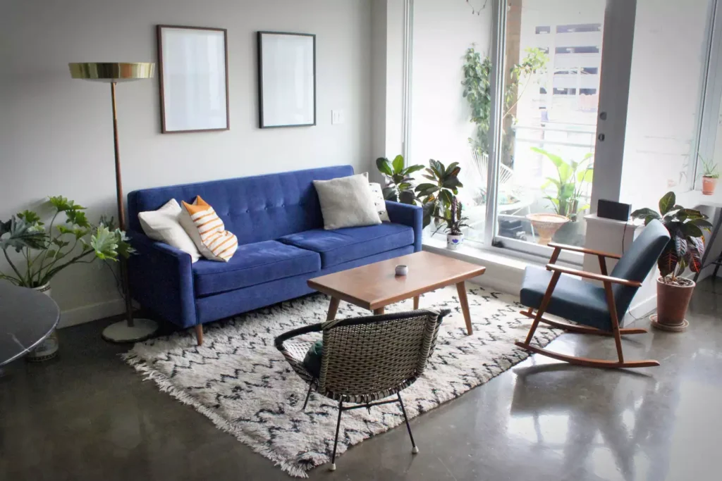 The pop of blue is a bold choice that anchors the minimalist room and gives it a clear focal point. The mix of a modern sofa with a vintage rocker creates a nice “collected” vibe.