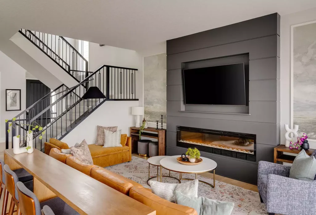 A sleek grey paneled wall houses a large television above a linear modern fireplace. A cognac leather sofa and a mustard yellow velvet bench offer plenty of warm-toned seating options.