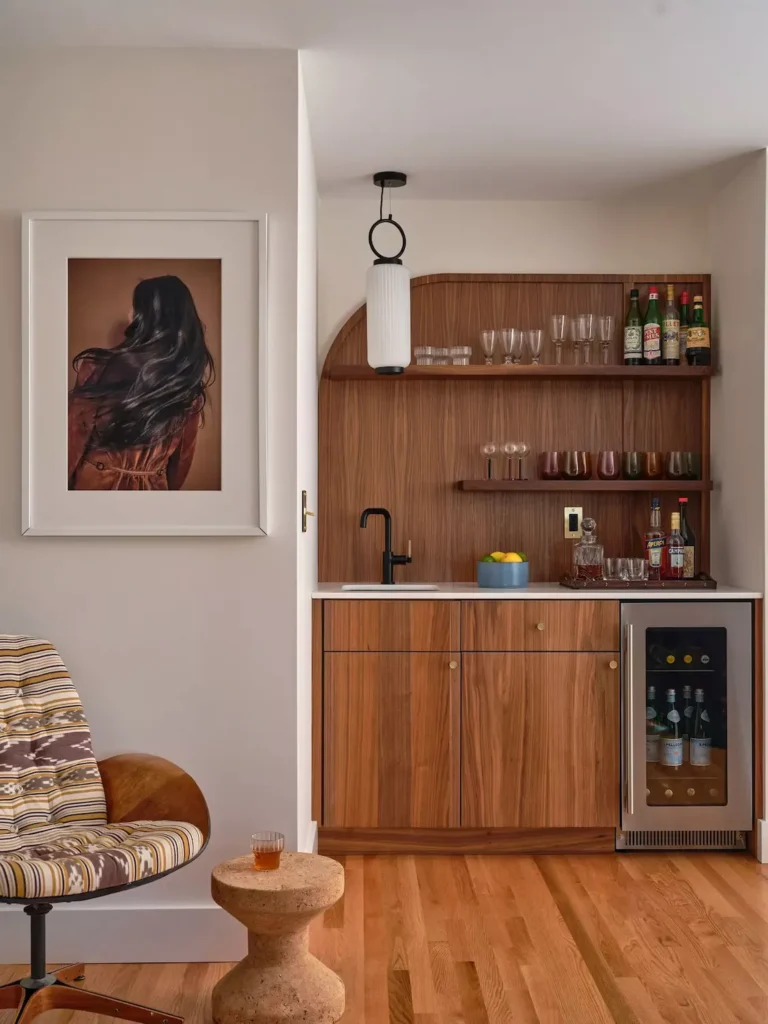A compact and stylish wet bar is tucked into a kitchen nook, featuring rich walnut cabinetry and a curved backsplash. A small cork stool and a patterned vintage-style chair sit nearby on light oak floors.