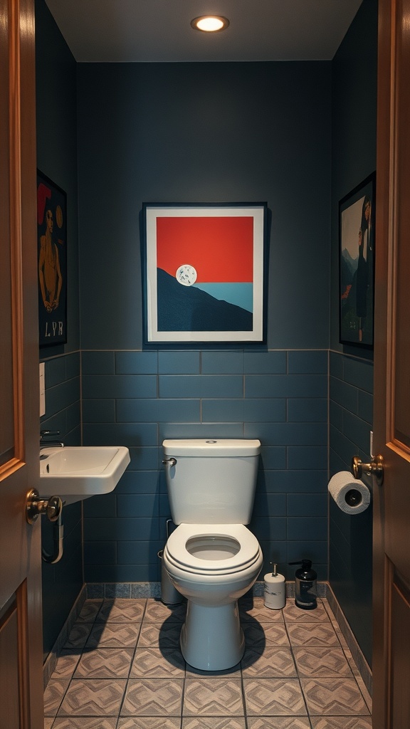 The combination of deep blue walls and the framed artwork gives the room a moody yet stylish atmosphere. The artwork contrasts beautifully with the neutral tiles and fixtures, creating a harmonious balance. Choosing art with bright hues can really uplift the vibe, especially in a room that often feels tucked away.