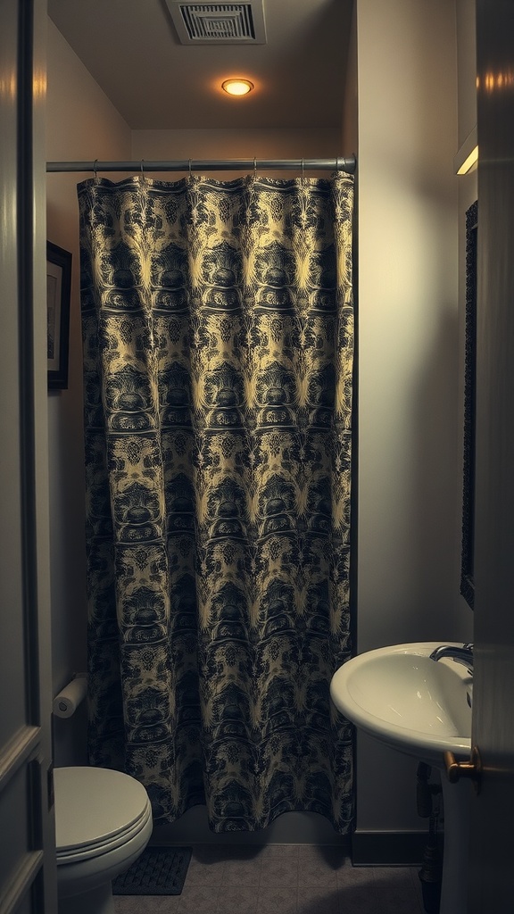 Shower curtains can transform a small bathroom from ordinary to unique. Just take a look at this one! The intricate design features a blend of dark and light tones, adding depth and a touch of sophistication.