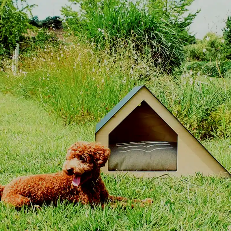 This sleek and contemporary outdoor dog house stands out for its extreme simplicity and clean lines, creating a minimalist A-frame structure. The house is made of smooth, light-colored material, likely wood or a composite, with dark trim, and is placed right in a wide, grassy field. A fluffy red-brown Poodle is resting happily beside it, looking relaxed in the sun.