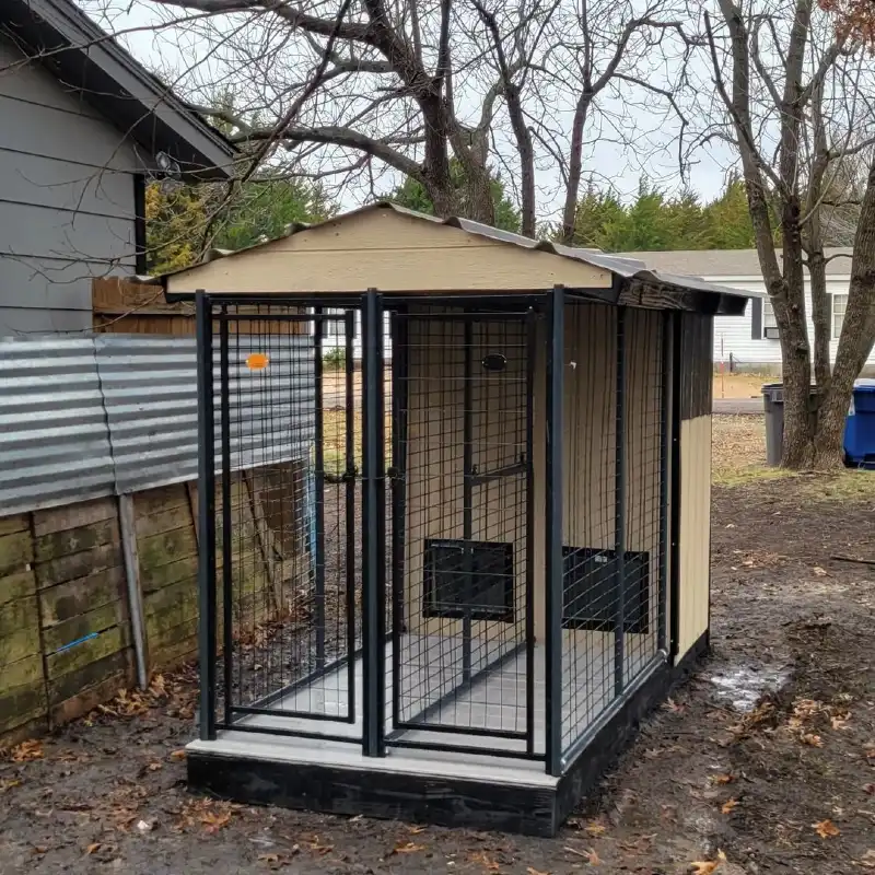 This design is a heavy-duty, multi-functional structure that combines a secure outdoor run with a sheltered, private sleeping area. It features a sturdy metal frame with high mesh walls for the run, and a fully enclosed section with solid walls and a sloped roof for the dog’s inner house. It is built on an elevated platform for better drainage and cleanliness.