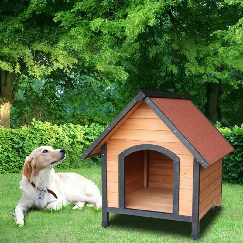 This is a classic and sturdy example of a functional outdoor dog house, featuring a traditional gabled roof and natural wood paneling. The exterior is finished with a warm, natural stain and features dark trim around the entryway and base, while the roof has a pleasant reddish-brown shingle color. The dog house is slightly elevated off the ground, a practical feature for drainage and insulation.