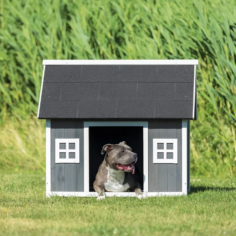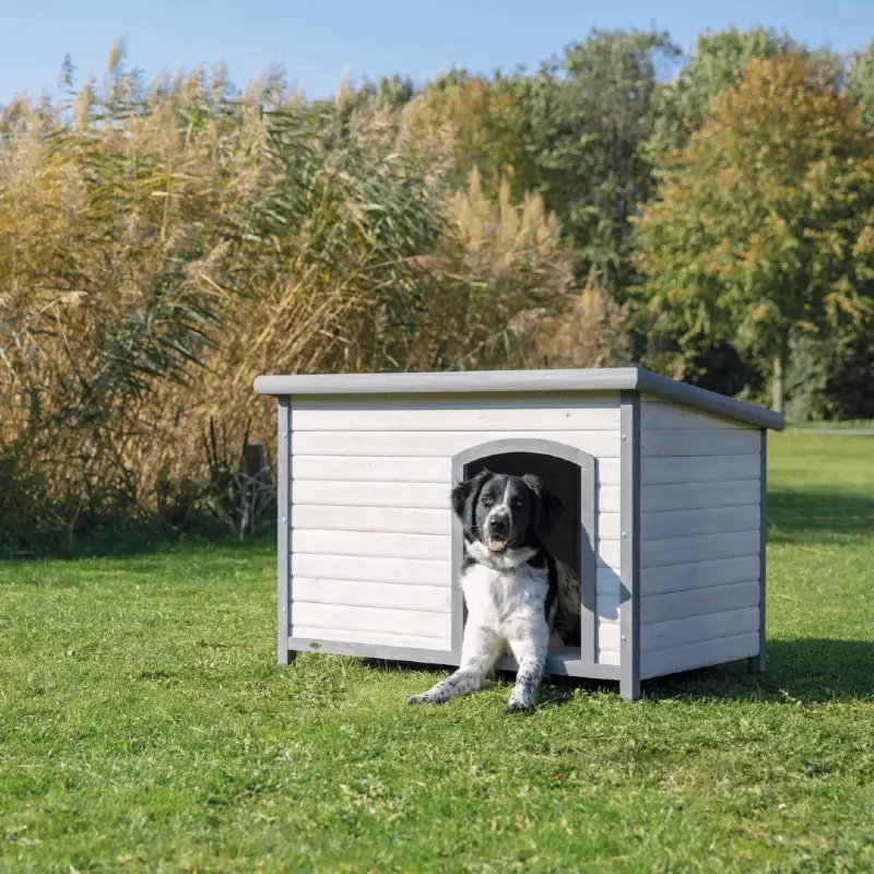 This charming outdoor dog house offers a clean, classic aesthetic that blends seamlessly into a lush, natural garden setting. It features white horizontal siding with contrasting gray trim on the roof and door frame, giving it a cozy, cottage-like feel. The structure is slightly elevated, which is excellent for keeping the interior dry and providing natural ventilation for your pup’s comfort.