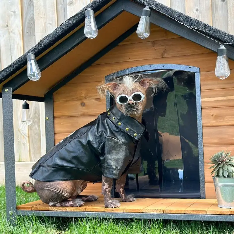 This incredibly stylish, dark-stained A-frame dog house instantly transforms into a glamorous retreat thanks to a few simple, dramatic design choices. The structure is elevated on short posts and features a sleek, dark roofline that is playfully adorned with charming, oversized festoon-style string lights. A confident, leather jacket-wearing dog sits poised inside a clear, modern entryway, completing the entire rock-and-roll vibe.