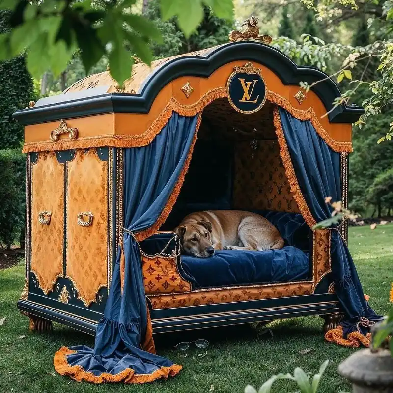 Moving into the realm of ultimate luxury, this extravagant outdoor dog house is styled like a majestic canopy bed or a miniature palace. It features rich, velvety textures in deep navy blue and burnt orange, complete with ornate gold accents, tassels, and draped curtains that create a truly palatial feel. A large, contented dog is resting comfortably inside on a thick, plush navy cushion.