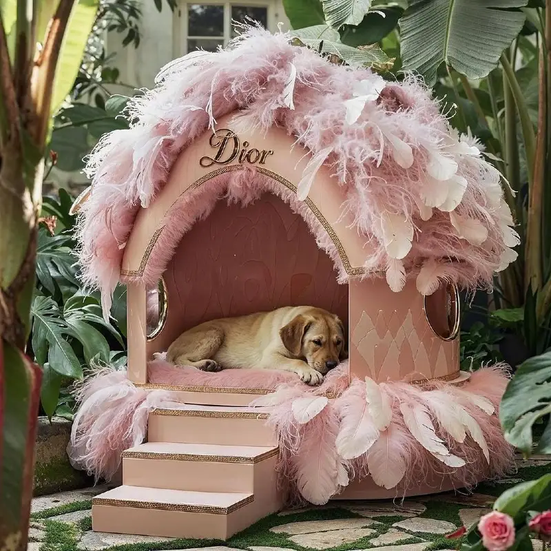 This truly spectacular and unique dog house is an absolute fairy-tale creation, featuring a soft pink exterior accented with glittering gold trim and a roof and base entirely covered in voluminous, delicate pink feathers. The house is a round, multi-tiered structure with small steps leading up to the sleeping area, where a golden lab rests on a pink, plush bed. It’s personalized with a gold designer logo on the front.