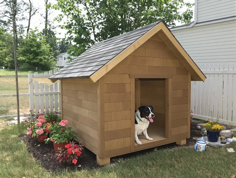Here we have a robust, traditional dog house that looks like a miniature garden cottage, featuring a warm, cedar-toned wood exterior with attractive shingle siding and a matching shingled roof. The structure is neatly situated in a corner of the yard and is enhanced by a small, curated border of dark mulch and bright potted flowers. A cheerful dog is standing in the doorway, tongue out and happy.