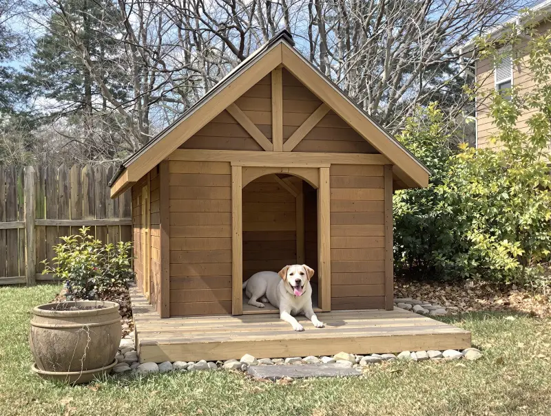 The design is visually effective because the covered deck elevates the dog house to the level of a true, luxurious cabin, offering a choice between sunbathing on the deck or retreating into the cozy inner chamber. It creates a mood of open, natural elegance and profound comfort. To replicate this, build a small, four-posted extension onto the front of your existing dog house and ensure the roof covers both areas.