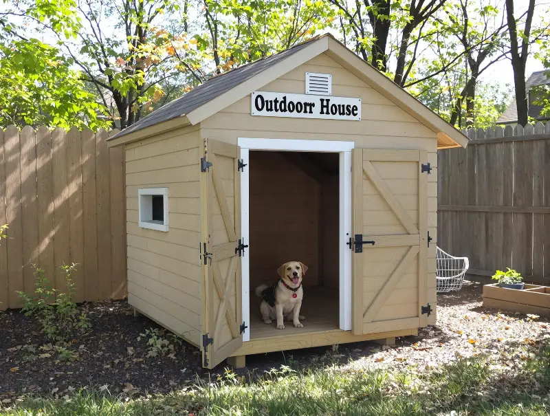 More of a miniature shed than a traditional dog house, this large, practical structure offers an immense amount of space and shelter. It’s painted a soft tan or beige and features a pitched roof, a small ventilation grate, and two functional barn-style double doors that open wide to allow easy access and plenty of light. A happy beagle sits prominently inside the large doorway, looking pleased with his spacious quarters.