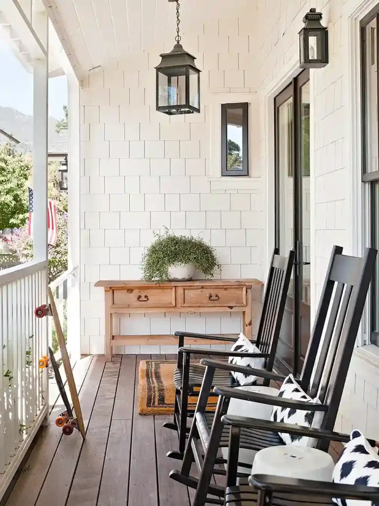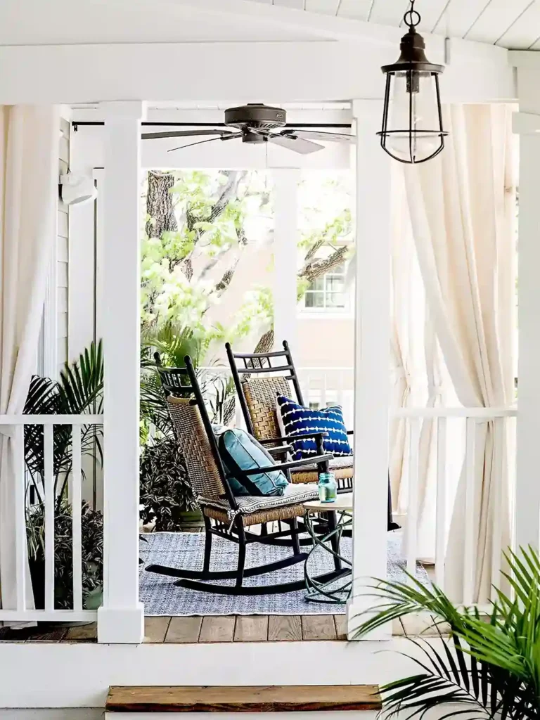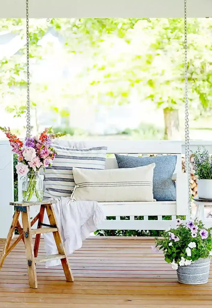 Think about a row of classic black rockers or a swinging daybed piled high with striped pillows and a soft linen throw.