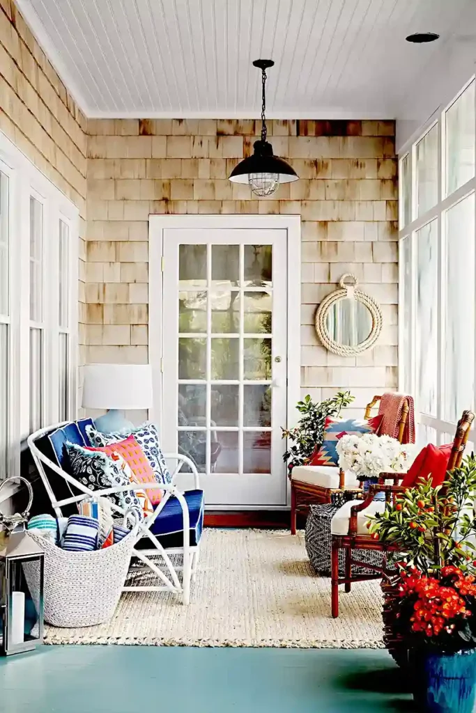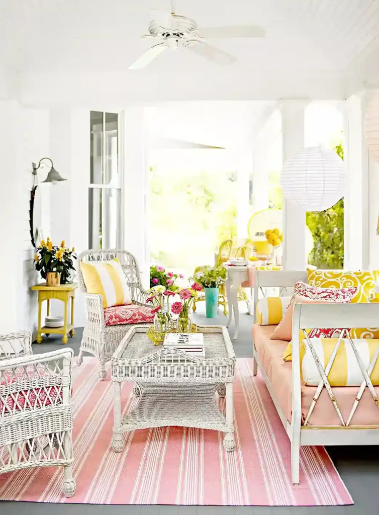 The energy is cheerful and energetic. If your porch feels a bit dark try adding yellow accents to mimic the feeling of sunshine even on a cloudy day.