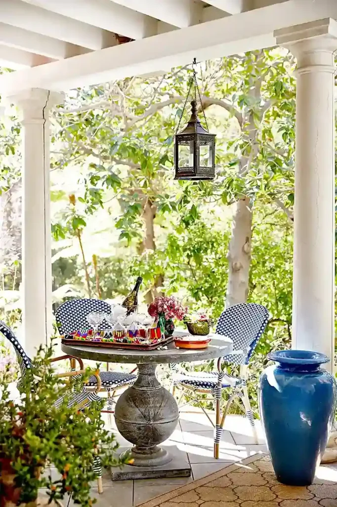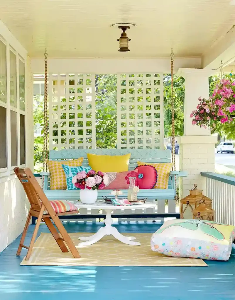 The mood is exotic and very creative. If you love a specific color don’t be afraid to use it on your porch where you can be a bit more playful than you might be inside the house.